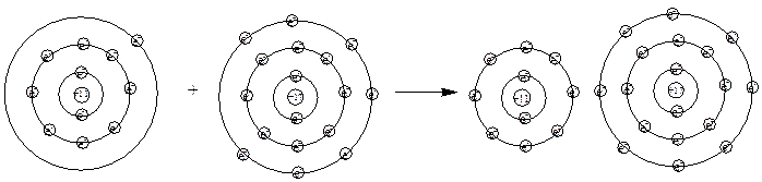 همانطور كه ديده مي شود، الكترون آخرين لايه اصلي اتم سديم كنده شده و اتم سديم به يون سديم تبديل مي شود. اضافه شدن همان الكترون به آخرين لايه اصلي اتم كلر، يون كلر را نتيجه مي دهد. در نهايت يونهاي مثبت سديم و يونهاي منفي كلر در كنار همديگر قرار مي گيرند و پيوند يوني موجود بين آنها يا موجود در ماده NaCl همان جاذبه خالص بين يونهاي ناهمنام با هم است. تبديل مواد سديم و كلر به اتمهاي سديم و كلر و سپس كندن الكترون از اتمهاي سديم نيازمند صرف انرژي هستند. دادن الكترون به اتمهاي كلر همراه با آزاد كردن انرژي است و قسمتي از (اما نه همه) انرژي صرف شده را جبران مي كند. قرار گرفتن يونهاي سديم و كلر در كنار همديگر و تشكيل ماده NaCl همراه با هم وجود جاذبه ها (مثلاً جاذبه بين يونهاي ناهمنام) و هم وجود دافعه ها (مثلاً دافعه ابرهاي الكتريكي يونها با هم) است، اما جاذبه بين يونهای ناهمنام تأثيرگذارتر بوده و در كل تشكيل ماده NaCl از يونهاي سديم و كلر مجزا از هم همراه با افزايش جاذبه ها و در نتيجه كاهش سطح انرژي پتانسيل و افزايش پايداري است. كاهش سطح انرژي پتانسيل و مقدار انرژي آزاد شده به حدي زياد است كه انرژي مصرف شده براي توليد يونهاي سديم و كلر را هم جبران مي كند، به همين علت است كه فلز سديم به راحتي و به سرعت با گاز كلر همراه با توليد گرما و نور واكنش داده و جامد NaCl (نمك طعام) را بوجود مي آورد. به عبارتي توليد جامد NaCl از مواد سديم و كلر در كل همراه با افزايش جاذبه ها و كاهش سطح انرژي پتانسيل و افزايش پايداري است.