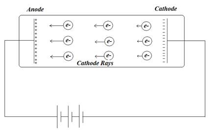 پرتوهاي كاتدي در ابتدا در سال 1869 توسط هيترف (Johann Hittorf) مشاهده شدند و بعدا در سال 1876 به نام پرتوكاتدي توسط گلداشتاين (Eugen Goldstein) خوانده شدند. همانطور که شکل بعدی نیز نشان می دهد، پرتو کاتدی جریانی از الکترونهای آزاد است که از صفحه فلزی منفی کنده می شوند و به سمت صفحه مثبت جذب می شوند. بعدها بررسي پرتوهاي كاتدي توسط دانشمندي به نام تامسون منجر به كشف الکترون و نسبت بار به جرم الکترون شد.