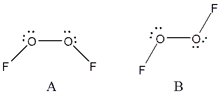 در مولکول O2F2 شکل فضایی دور هر اتم اکسیژن به صورت خمیده است. این دو شکل خمیده را مثلا به دو صورت زیر می توان ترکیب کرد: