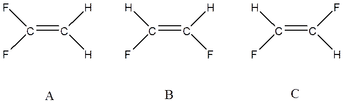 ترکیبات A,B,C فرمول یکسانی دارند اما ترکیبات یکسانی ( قابل انطباق بر هم) نیستند، بنابراین ترکیبات A,B,C ایزومر همدیگرند. ترکیب A از نظر ساختار پیوندی با ترکیبات B و C فرق دارد، بنابراین ترکیب A ایزومر ساختاری ترکیب B یا ترکیب C است. ترکیبات B و C بخاطر ممانعت چرخش حول پیوند نمی توانند بهم تبدیل شوند، بنابراین ایزومرهای سیس- ترانس یا ایزومرهای هندسی همدیگر هستند. ترکیب B که در آن دو گروه یکسان فلوئور در یک سمت پیوند با ممانعت چرخش قرار دارند، ایزومر سیس و ترکیب C که در آن دو گروه یکسان فلوئور در سمت های مخالف پیوند با ممانعت چرخش قرار دارند، ایزومر ترانس است.