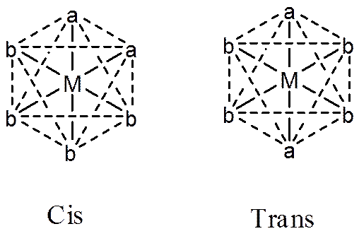 برای Ma2b4 که شکل فضایی دور اتم M به صورت هشت وجهی است، ایزومرهای سیس و ترانس زیر را می توان در نظر گرفت:
